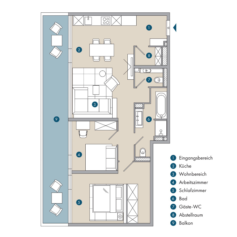 Bei der technischen Ausstattung sowie der Einrichtung der Bäder kommen bekannte, hochwertige Marken zum Einsatz. Für das Interieur jedes Apartments steht ein Designpaket zur Verfügung, das klassische Formen und moderne Elemente verbindet. Maritime Farben und natürliche Oberflächen fügen sich perfekt in die Umgebung ein. Stilsicher ausgesuchte Möbel und hochwertige Accessoires versprechen erstklassigen Komfort und ein gemütliches Wohnambiente.